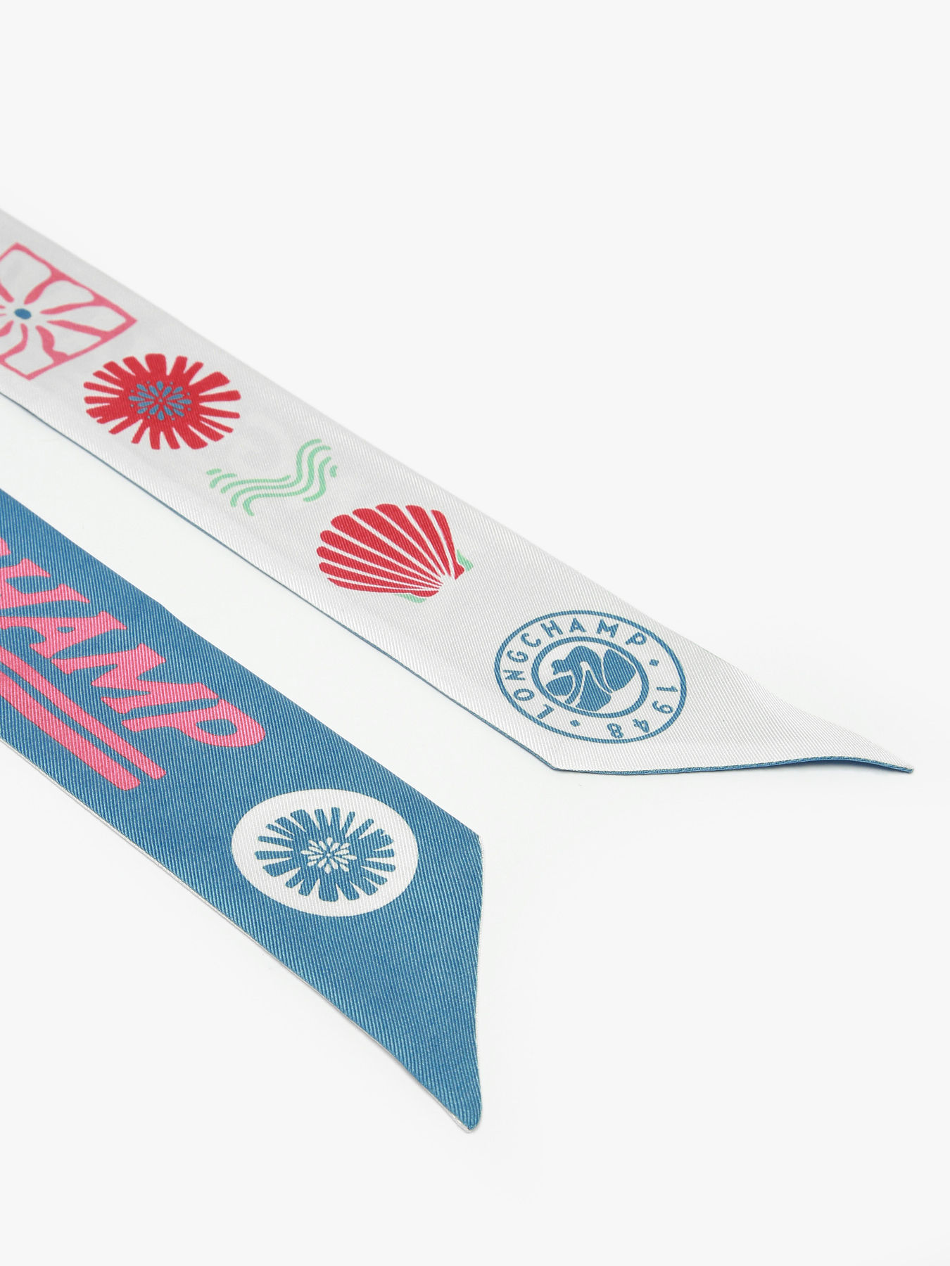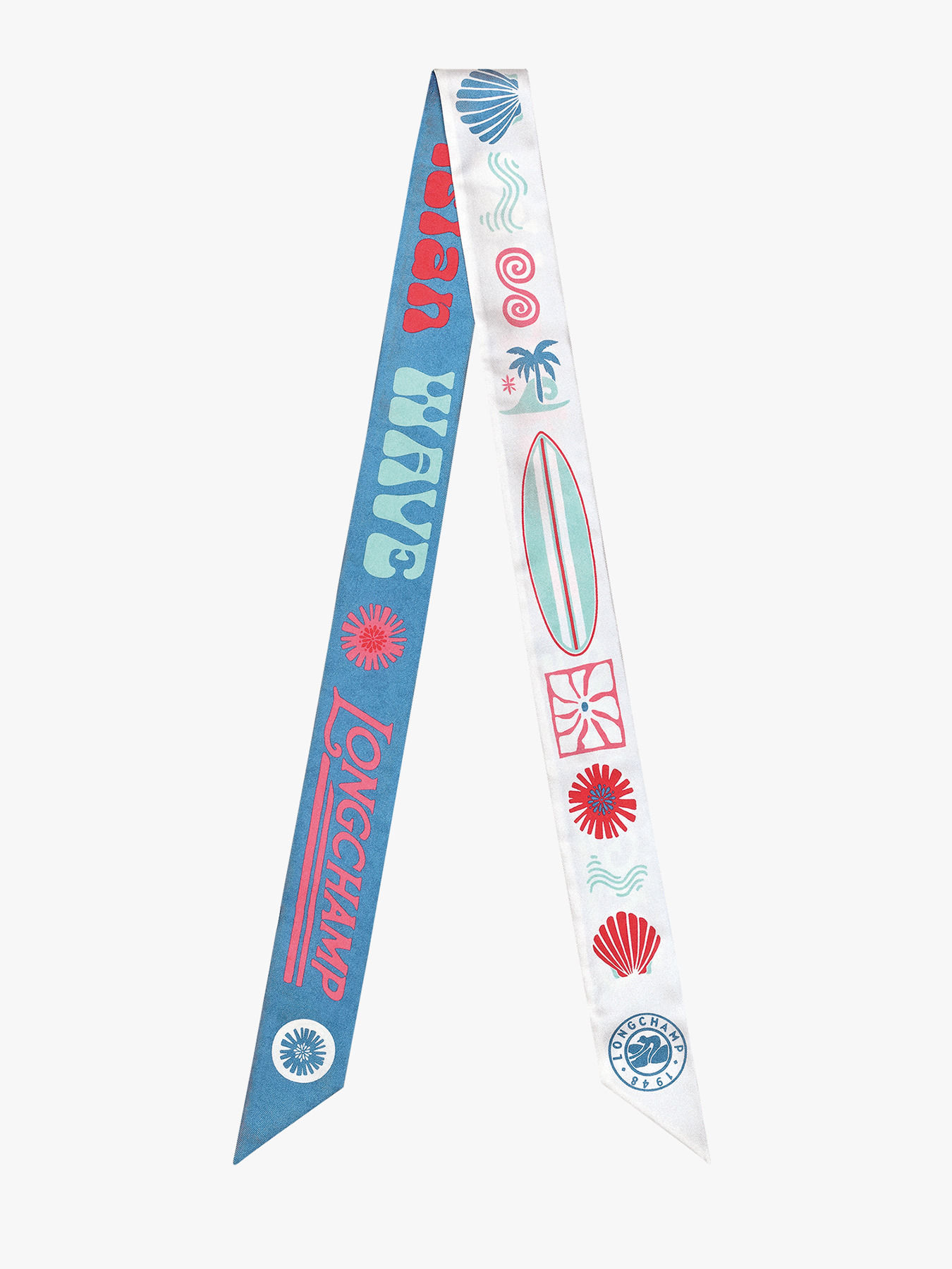 The LONGCHAMP Catch The Parisian Wave silk headband perfectly embodies the brand’s surfer spirit, highlighted by the retro slogan “Catch the Parisian Waves.” Its organic print combines fins, shells, corals, wave ripples, and sunny details, creating a vibrant oceanic universe. The soft, sun-faded tones evoke long summer days spent between sea, sky, and freedom, bringing a sense of freshness and liberty. This headband is both an elegant and summery accessory, perfect for adding a touch of nature and lightness to your outfits.